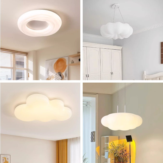 在燈具的選擇上,如果預算充足,就直接做無主燈,柔光為主,硬光為輔。如果預算低,就直接選木質的造型燈,比如南瓜燈、曲奇燈、云朵燈等,色溫選3000 K到4000 K的更溫馨。