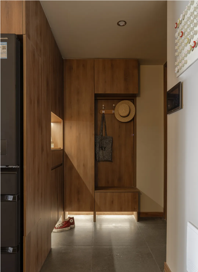2、一體化玄關(guān)設(shè)計(jì):結(jié)合鞋柜、穿衣鏡、換鞋凳和洗手臺(tái),這樣的設(shè)計(jì)既節(jié)省空間,又功能豐富。