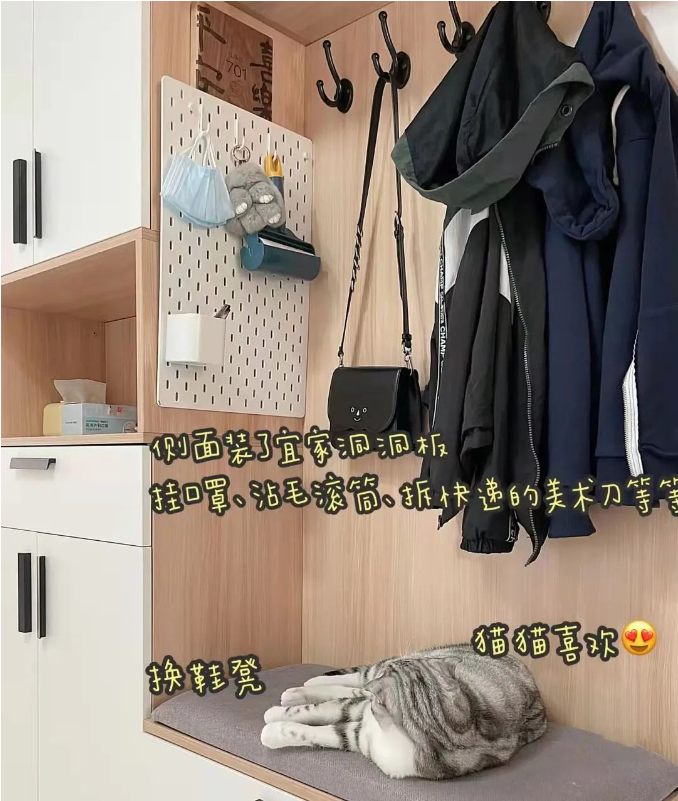 洞洞板玄關(guān):經(jīng)濟(jì)實(shí)惠且功能靈活,可以隨意調(diào)節(jié)層板,滿足不同的收納需求。