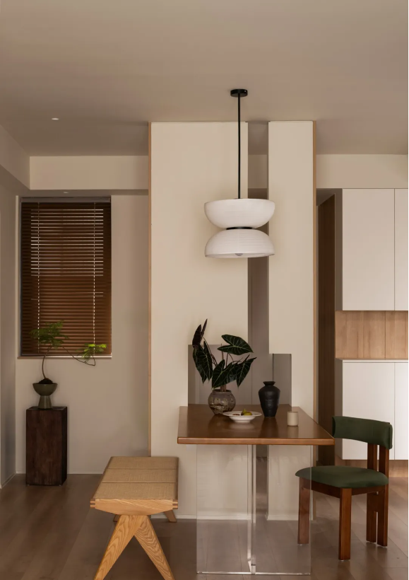 入戶以回歸自然為主旨,將傳統(tǒng)的可觀游園林設計手法帶入,餐桌的正中位置為點,新建墻體,將玄關獨立。