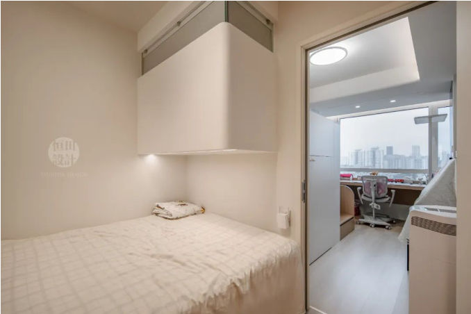孩子現在喜歡和奶奶待在一起,所以就把原主臥拆成兒童房和長輩房。空間不夠放兩張2m的床,就將立面空間利用到位,保證睡覺時兩條腿都能伸直。